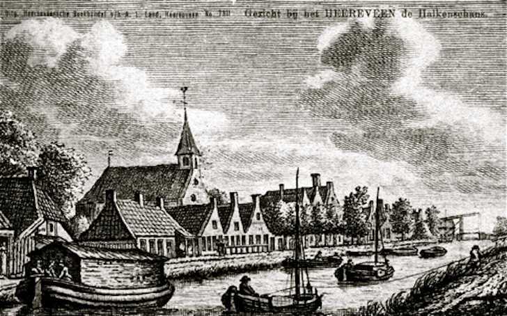 Wat zien we nou eigenlijk op deze prent ? Het laatste deel van de Heerensloot en de Heerenwal - of zoals op de kaart van Gosen van Terwisga uit 1789 staat ‘Compajons vaert’ en ‘Schanserwal’. Aan de linkerkant staan een vijftal huizen en daar rechts van zeer prominent de kerk van Nijehaske. Die staat er eigenlijk nog maar kort, want hij wordt op 10 december 1775 ingewijd door ds. J. Dix. In de topgevel is van het leggen van de eerste steen nog een herinnering te vinden in de vorm van een wapensteen van Klaas Tjerks Hiddinga, ontvanger en dorprechter van Nijehaske. Een poging om via een speciekohier van Nieuwehaske uit 1778 greep te krijgen op de bewoning van de verschillende goed zichtbare huizen en huisjes op dit streekje aan de Schanserwal brengt ons niet veel verder. Wel vinden we in die lijst de naam van Dnús (afkorting van Dominus) Dix, die in een huis met 2 schoorstenen woont met een gezin van 4 hoofden. Het is in die tijd natuurlijk niet ongebruikelijk, dat de ‘pastorie’ vlakbij de kerk staat. Daarvoor staan op de lijst twee nummers, te weten 95 en 96. Zijn dat huisnummers of volgnummers ? Spijtig genoeg staat in dat dossier het gebouw van de ‘kerk’ als - niet-belastbaar - object niet verantwoord.