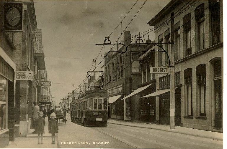 “Hierbij nog een foto van de Dracht uit het jaar 1940. De toen ter tijde electrische tram, die een dienst onderhield tussen het Friese Haagje (station) en Oranjewoud (speeltuin) bleek een gevaarlijk obstakel voor de toch al smalle hoofdstraat. Geen wonder dat door de gemeenteraad van Heerenveen werd besloten de vergunning in te trekken. Vooral des zomers werd van dit vervoermiddel een druk gebruik gemaakt door vakantiegangers.....” “Zo zou het onderschrift onder deze foto hebben kunnen luiden, ware het niet dat men hier te doen heeft met een geslaagde trucfoto. De kaart werd destijds in een aantal van 2000 stuks uitgegeven door het foto-atelier fa. G. Brouwer en zoon te Heerenveen. De foto werd ter beschikking gesteld door de Stichting Oudheidkamer Heerenveen.”