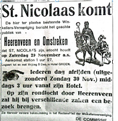 Een tweede reden om het tot een ‘bijzonder’ gebeuren te bestempelen ligt in een royale advertentie van de pas opgerichte ‘Winkeliers-Vereeniging’ in het Nieuwsblad van Friesland van vrijdagavond 21 november 1919, tweede blad. Daarin wordt over de breedte van de kolommen 4, 5 en 6 (17.1 cm breedte) een in het oog springende tekst met illustratie van 18.5 cm hoogte geplaatst, met als slogan: St. Nicolaas komt !