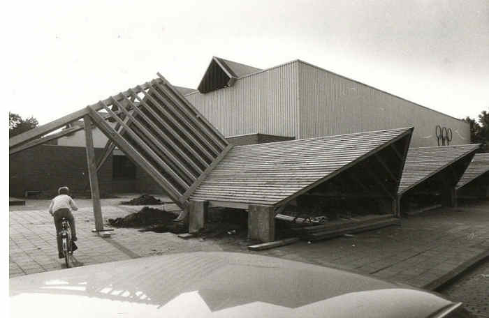 Nevenstaande foto geeft in ieder geval een behoorlijk beeld van de wording van het kenmerkende object. Een stevige metalen constructie wordt voorzien van een houten balkenconstructie en bedekt met dunne plankjes van cederhout die geschoteld op de balkenconstructie worden vastgezet. Nog voor het afgebouwd is, vindt de jeugd het al een spannende plek om aan hun behoefte tot stunten tegemoet te komen. Dan blijkt de keuze van de zeer lichte constructie met cederhout zeer beslist niet bestendig tegen de kunstobjectopvattingen van de jeugdige gebruikers. Zowel skateboardafdalingen vanaf het dak, als sterktetesten van de constructie onder het dak maken dat de jeugdhufterproeven binnen twee jaar het project doen verkeren in een deplorabele staat. Dat verdriet ook de leden van de zogenaamde werkgroep 1%-regeling. Deze nemen in april 1983 het initiatief om een voorgenomen afbraak te keren door aan te bieden het werk met eigen krachten uit te voeren als de gemeente een nieuw en sterkere houtsoort beschikbaar stelt. Jaap Sybrandy, secretaris van de werkgroep; Tjerk de Vries, oud-leraar creatieve handvaardigheid; Joop Holterman, kunstenaar van bijzondere projecten, en zelfs ontwerper-architect Hugo van Lelyveld bieden hun werkkracht aan. De gemeente zwicht voor het voorstel om omstreeks 10 juli 1983 een sterk verbeterde fietsenstalling opnieuw in gebruik te kunnen nemen.