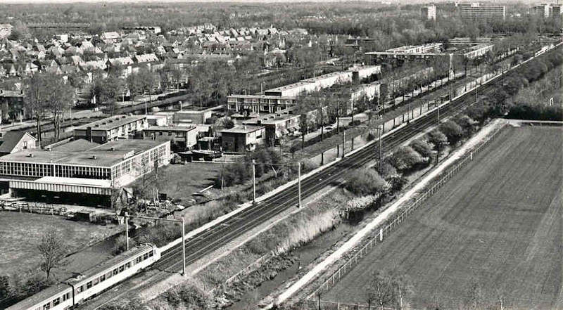 Kijken we naar fotonummer 06743 uit de collectie van het Museum Willem van Haren dan kijken we naar een professionele opname van fotojournalist Dick Verton ! De eerste vraag die bij ons opkomt ligt voor de hand: is dit een luchtfoto (misschien vanuit een ballon?) of mogen we aannemen, dat Verton op het balkon heeft gestaan van één van de Muntflats. De meest oostelijke van “De Drie Gebroeders” - zoals de drie 14 verdiepingen hoge flats vanaf de bouw al worden genoemd - is de meest waarschijnlijke: dat is ‘Romsicht’ ! Hoe dan ook, Verton is er zeker in geslaagd om de lange strook langs de oostkant van de spoorlijn goed in beeld te brengen.