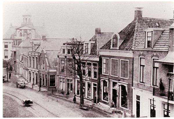 Met de op de stoep staande kisten en kratten is de relatie met de winkel stellig het geval, terwijl ook de markiezen boven de winkelramen en de louvreluiken van de bovenetage de suggestie ondersteunen dat dit in het zomerseizoen is. Let ook op het fraaie smeedijzeren stoephekje naast de deur van het buurpand - het koffiehuis van Albert Steenbergen - eerder bekend als logement “De Zon”.