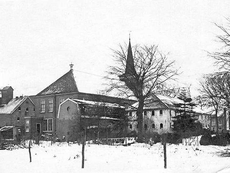 Mede door Luitje Feits verandert niet alleen het kerkelijk landschap in Heerenveen, maar ook door de kapitaalsinvesteringen in de bouw van woningen en herenhuizen. Het door hem geïnitieerde christelijk separatistische kerkgenootschap krijgt de beschikking in 1865 over het gebouwtje ten noorden van de tuinmanswoning van jhr. Lycklama à Nijeholt, met als erfafscheiding een dwarswijk. Zwager Hendrik Jan Groenier - gehuwd in 1833 met Maria Elisabeth Feits - staat hem bij de organisatie terzijde. Bovendien trekt Feits voor de schoolkeuze van zijn kinderen de consequentie uit zijn geloofsprincipes, en sticht een schooltje voor Christelijk Nationaal Onderwijs met woning voor de hoofdonderwijzer. De eerste die de particuliere ‘School met den Bijbel’ mag aansturen is de uit Amsterdam afkomstige predikant H.P. du Pré. Dick Bunskoeke heeft er gedetailleerd over geschreven in zijn boekje “Een hecht gebouw. Honderd jaar christelijk onderwijs in Heerenveen” (1989). Dat gebouw is op deze prentbriefkaart niet zichtbaar omdat ze zich bevindt op een plaats voorbij de Heerenhuizen en een flink stuk vanaf de rooilijn.