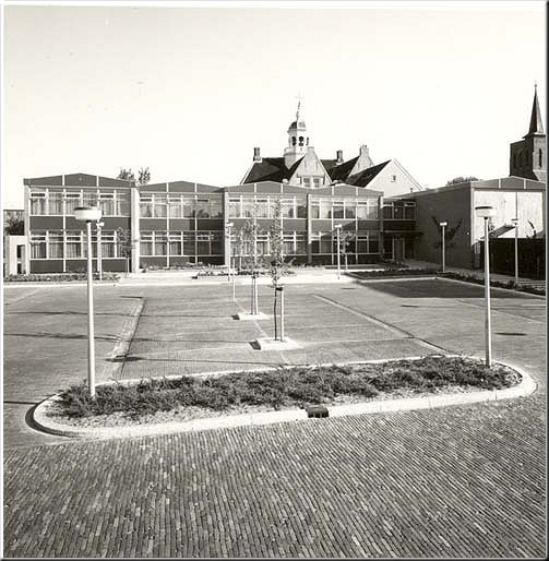 Dit ‘maagdelijke’ plein in de late middagzon ligt als-het-ware te wachten op de gasten voor de opening van de in gebruikneming van de uitbreiding van het gemeentehuis met het administratiegebouw. Deze fotonr. 302 heeft een ‘plusminus’-datering meegekregen van de fotobeheerders van het museum Willem van Haren. Waarom? Wel, dat is simpel: de fotograaf is niet bekend; het lijkt waarschijnlijk dat het een foto is die in de krant heeft gestaan; het heeft jaren gelegen in een ‘schoenendoos’ zonder dat er iemand naar omkeek ! Ziedaar, de simpele verklaring van de datering ± 1979. Dat het achter Crackstate ligt, leidt onvermijdelijk tot de conclusie dat de fotograaf op de K.R. Poststraat heeft gestaan. Links langs het nieuwe kantoorgebouw vangen we nog net een glimp op van het pakhuis van ijzerhandel Gerrit Overdiep aan de zuidkant van de Oude Kerkstraat. Rechts een iets forsere glimp van een der R.K.-kerktorens.