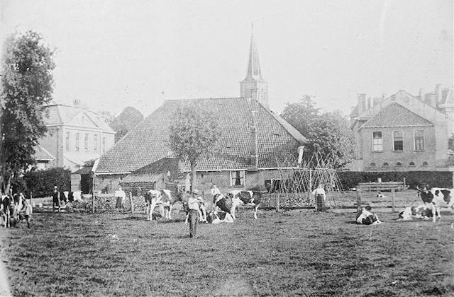Het grote ‘pakhuis’ of ‘schuur’ (rechts) maakt omstreeks 1900 deel uit van de bezittingen van de erven van Haring Pieters Romkes, waarvan zoon Pieter voor meer dan de helft het eigendom heeft en tevens gebruiker is. Hij blijkt veehouder en winkelier en wordt later opgevolgd door zijn zoon Kees Romkes, die ook veehouder is. De kavels tussen de Zwartesteeg en de Romkessteeg hebben geen achterompad meer, d.w.z. de bebouwing loopt van de Dracht door tot de oever van de Molenwijk.