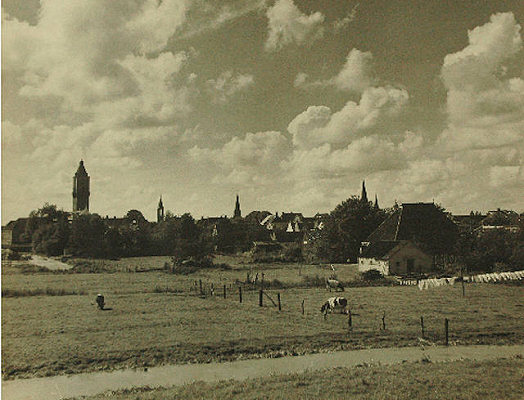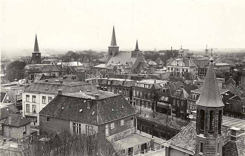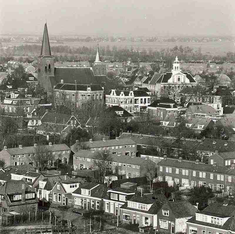 Aan de ‘Watertoren’ (1914-1980) hebben we deze vogelvluchtfoto of panorama-foto te danken. Jaco (of Jacco) Bleeker heeft in 1956 zijn relaties kunnen overtuigen van de noodzaak de toren te mogen beklimmen. Die exercitie blijkt verre van eenvoudig, gezien de vormgeving van de toren met slechts naar vier zijden een minuscule uitbouw. De ruimte geeft slechts beperkte mogelijkheden voor een ideale camerapositie. Stelt u zich eens voor dat u hoogtevrees heeft en claustrofobisch op enge ruimte reageert en dat allemaal op circa 30 meter boven de begane grond.
