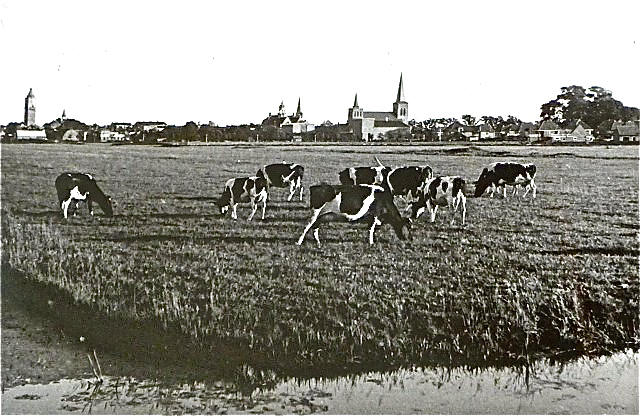 Deze keer is de fotograaf - ongetwijfeld ook nu weer Philippus Weijer - nog laat in de middag op pad geweest, getuige de lange schaduwen van de koeienlijven, maar zichtbaar is ook dat de noordelijke wand van schouwburg en gevangenis nog flink belicht worden. Net als de noord-westelijke gevels van de Katholieke kerk en de Watertoren.